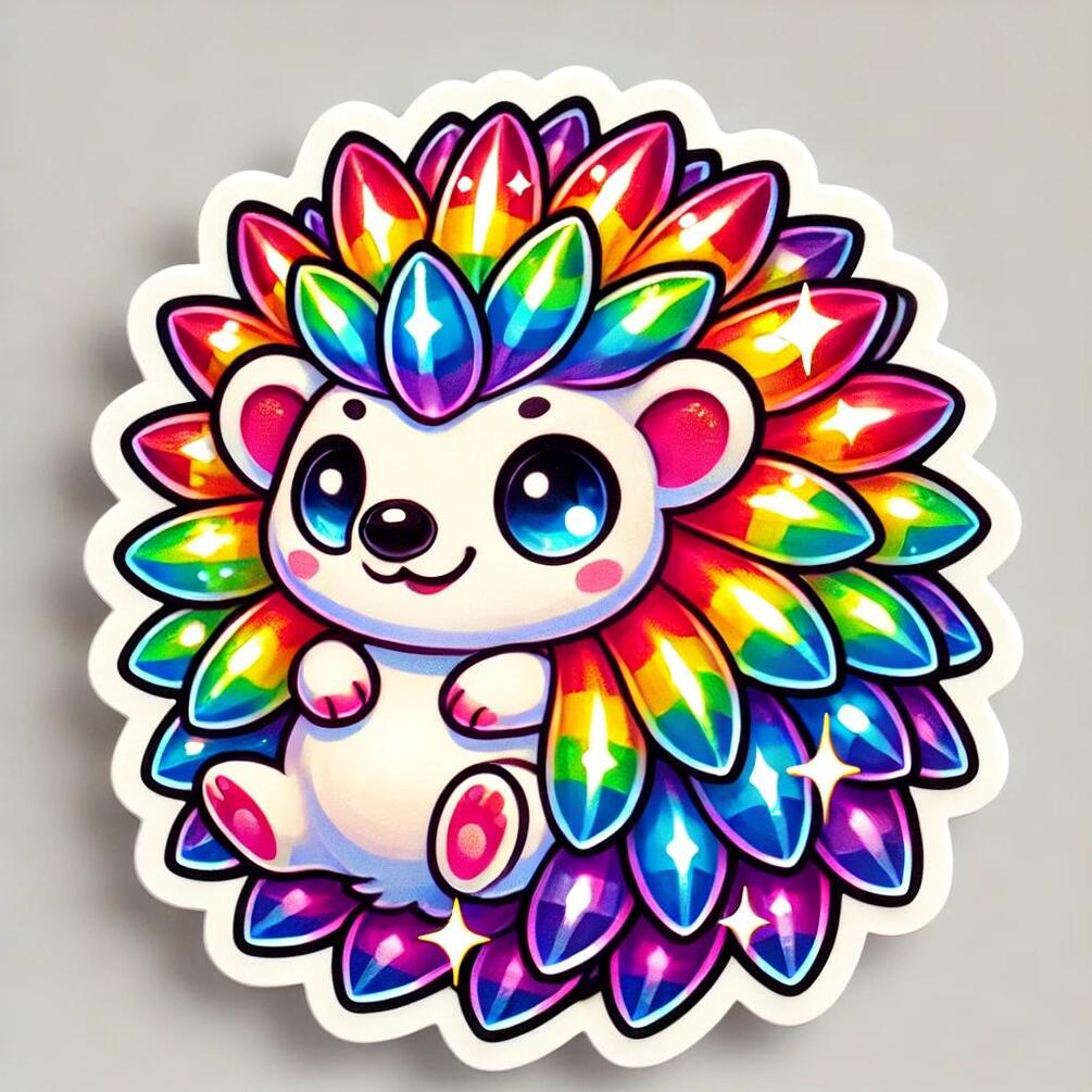 A die-cut sticker design of a shiny and adorable rainbow hedgehog